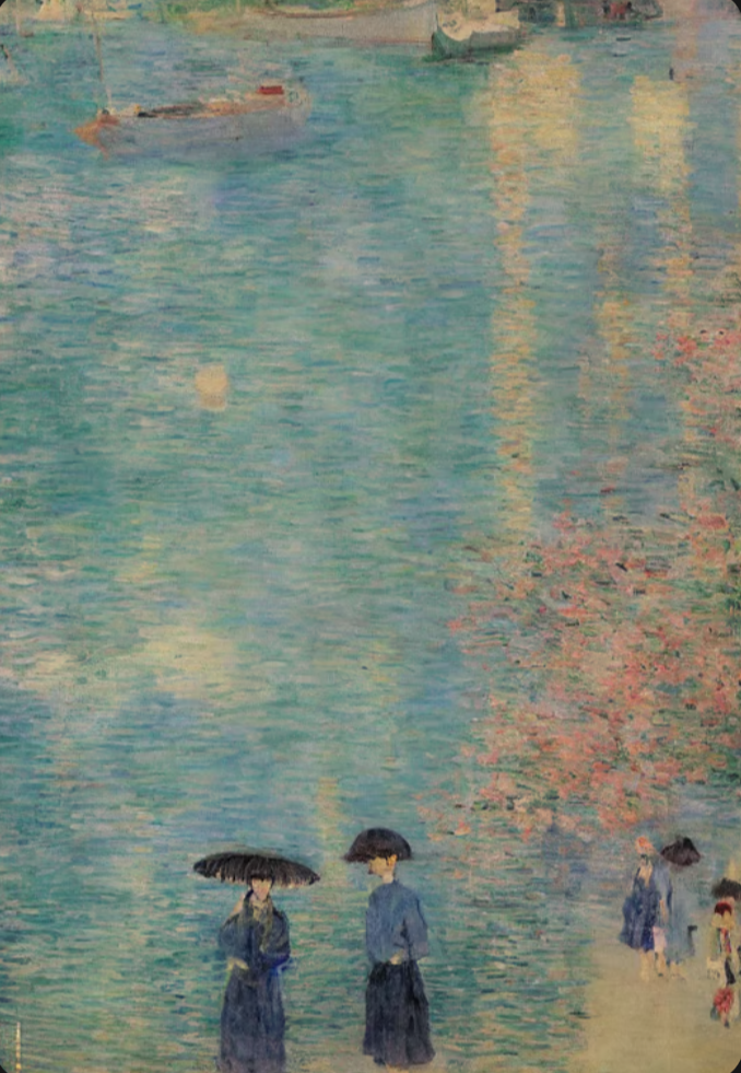 짐작컨대 모네의 일출, 베르트 모리소의 붓놀림, 신카이 마코토와 지브리 스튜디오의 작풍을 고려한 AI가 완성한 그림 아닌가 싶습니다. PROMPT HUNT 라는 웹사이트에 게시되어 있는 걸 보면 그렇습니다. 정말 이 작품을 AI가 그렸다면 ···, 아직 할 말이 없습니다만 실로 충격적입니다. 몸이 살짝 바르르 떨리더군요.