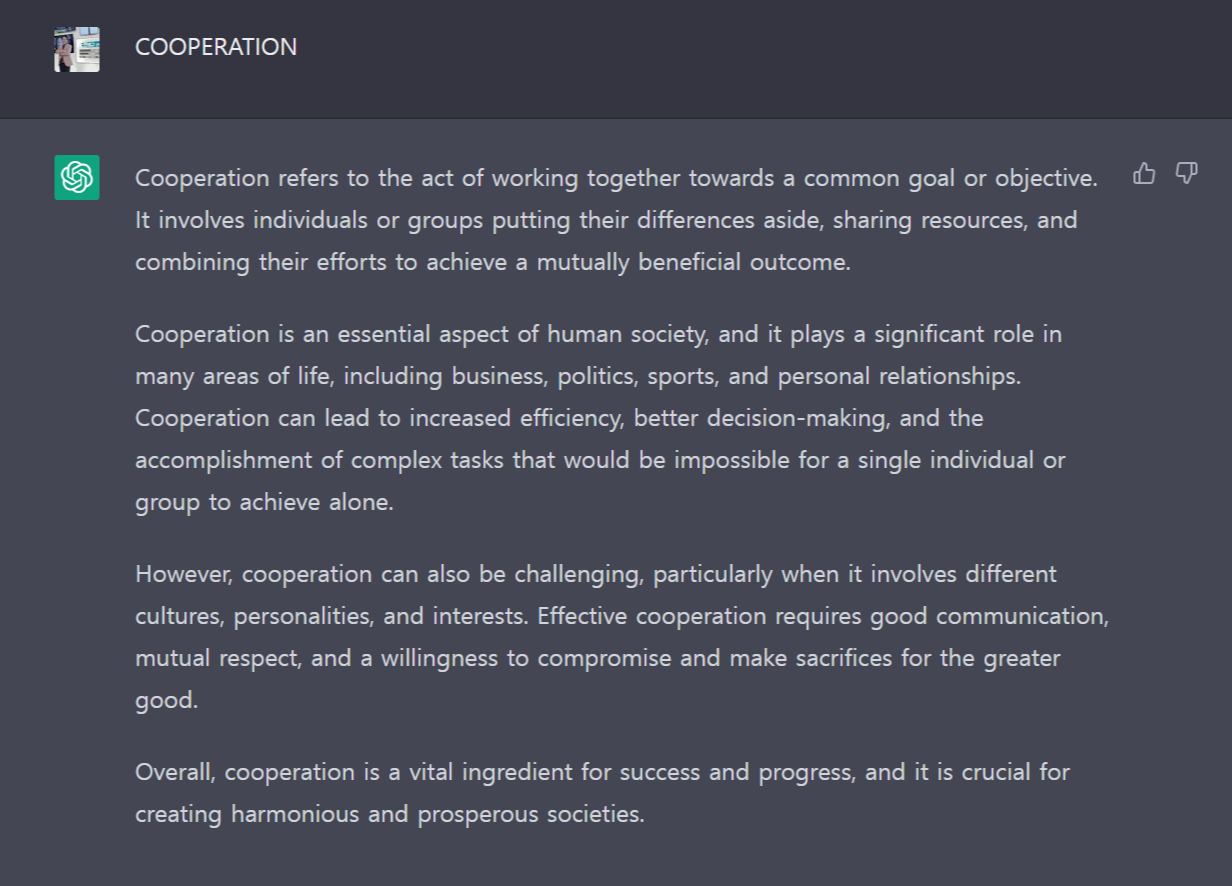 안녕하세요. 필립의 전략입문 노트입니다. 요즘 챗GPT가 아주 핫합니다. 트렌드 2023에서 전망한 '선제적 대응기술'이 전망한 첫 번째 기술 트렌드인 듯합니다. 그래서 한번 경험을 해 봤습니다. 구글로 로그인을 한 다음 '협력 cooperation'에 대해서 물었습니다. 결과는 굉장히 정제된 언어로 된 글이었습니다.